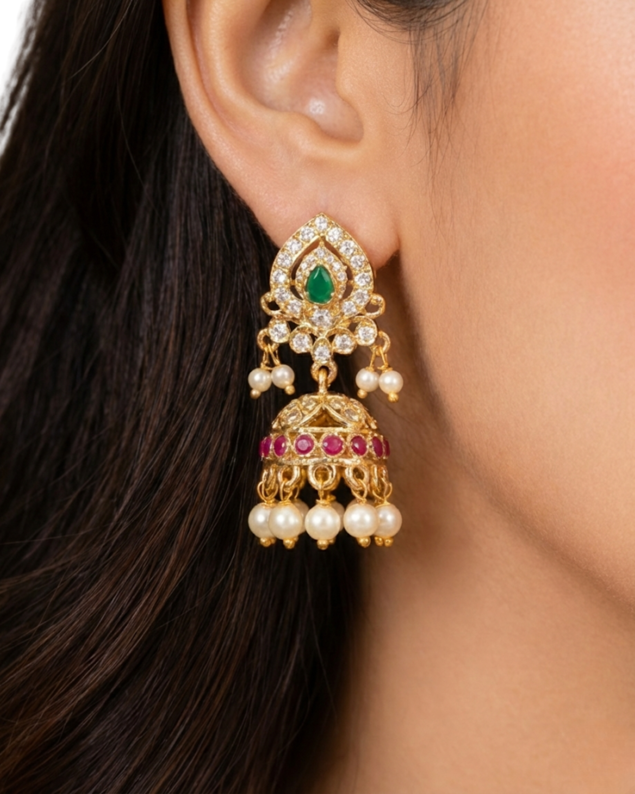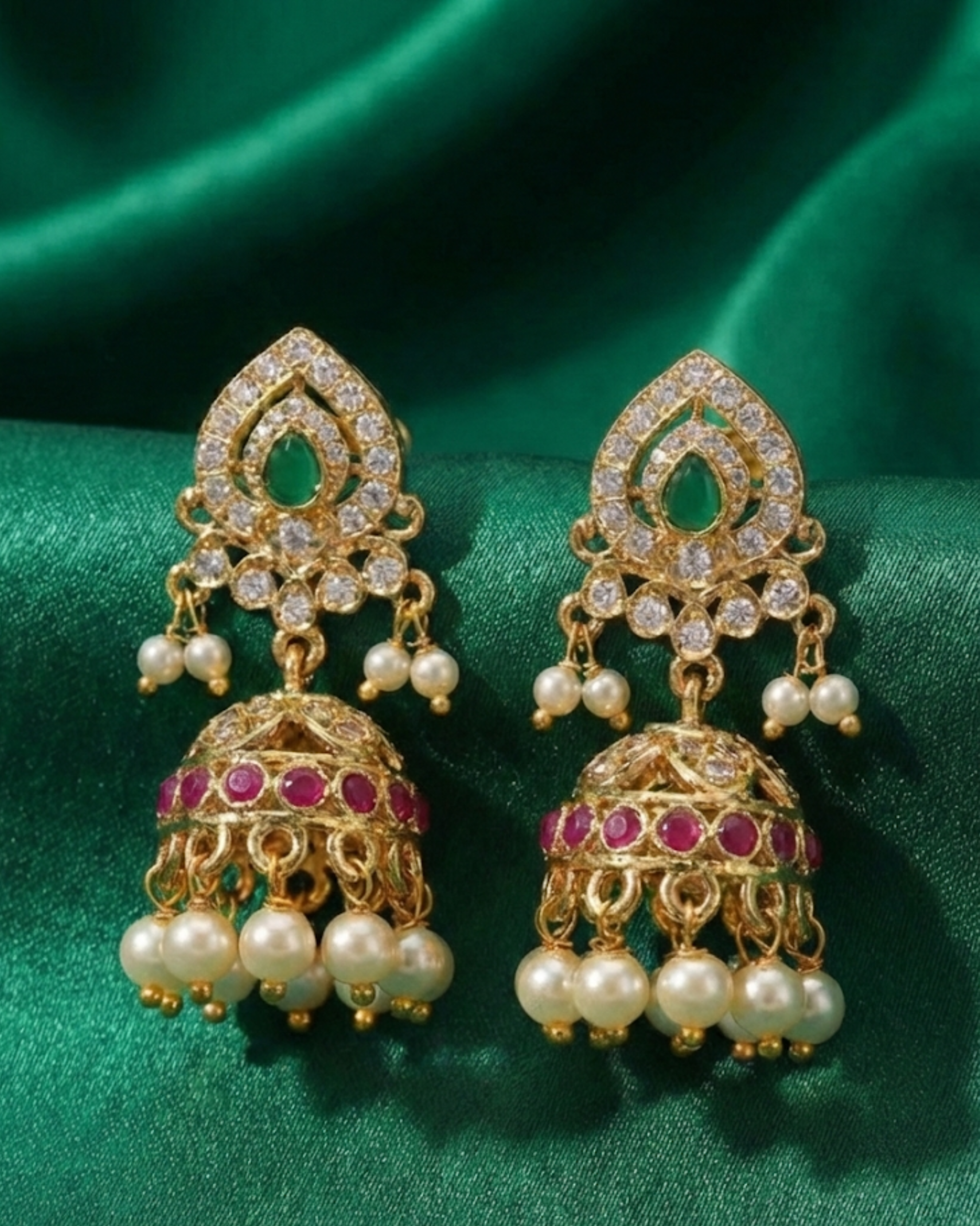 Beautifully designed gold-finish jhumka earrings featuring an emerald-green stone crest, sparkling crystal detailing, ruby accents, and layers of delicate pearl drops—perfect for weddings, festive occasions, and traditional celebrations.
