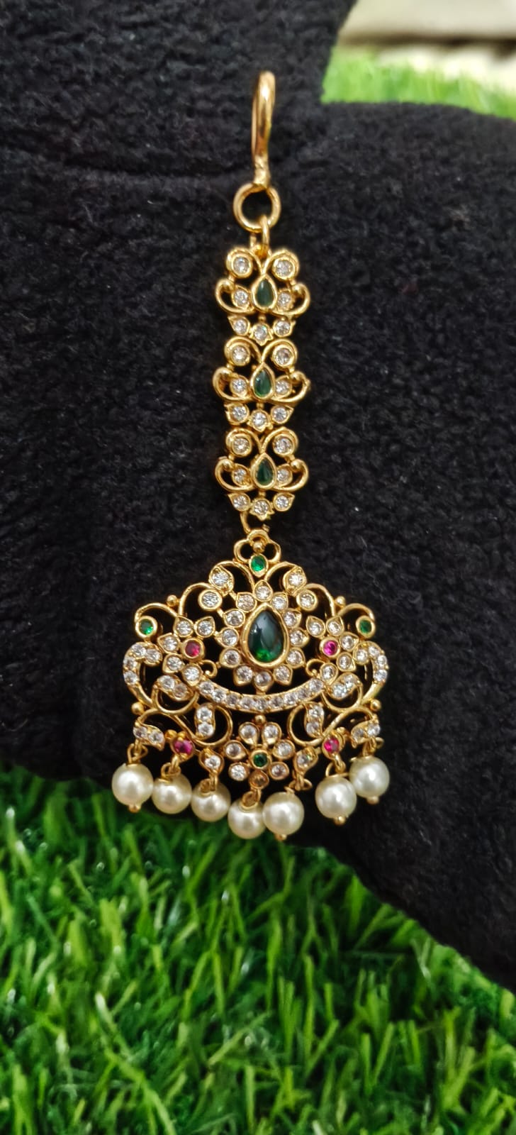Exquisite gold-toned maang tikka adorned with emerald and ruby accents, sparkling stones, and graceful pearl dropsâperfect for bridal and festive wear.