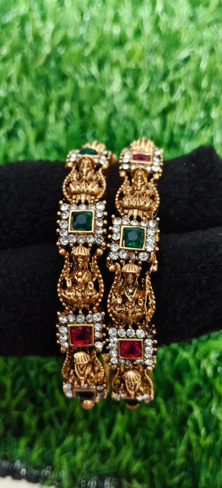 Luxurious antique gold-toned temple bangles featuring detailed Lakshmi motifs, square ruby and emerald stones framed with sparkling crystalsâperfect for bridal and traditional occasions.