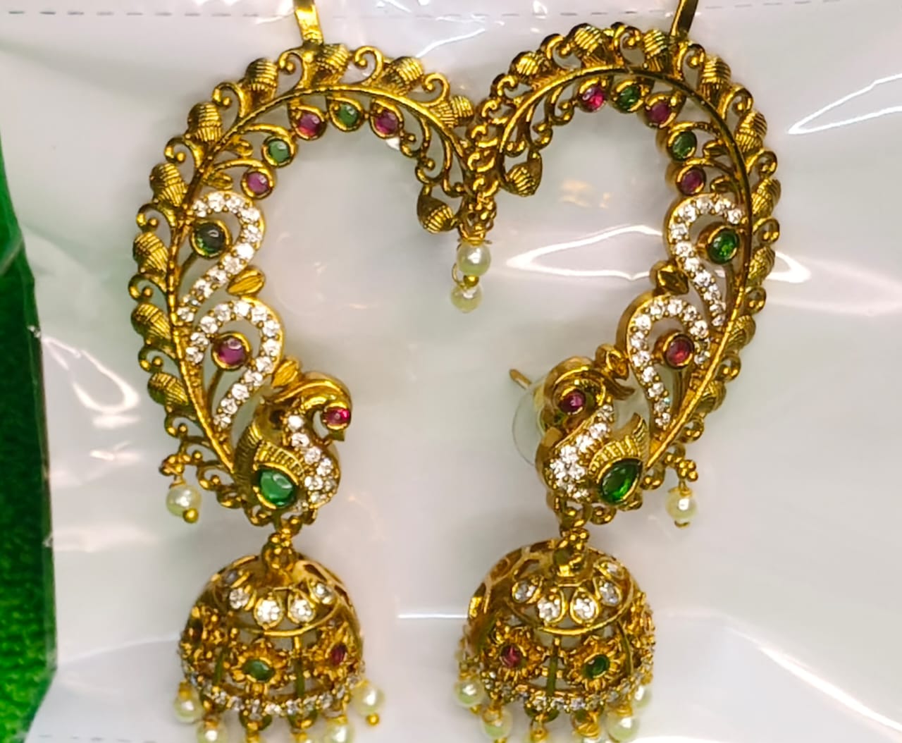 Magnificently crafted peacock-inspired jhumka earrings featuring an elegant curved silhouette, richly embellished with ruby-pink, emerald-green stones, shimmering crystal accents, and pearl drops—ideal for weddings, bridal looks, and grand festive occasions.