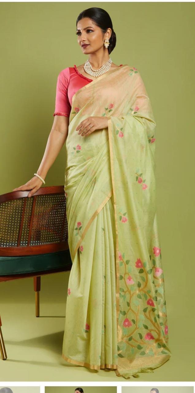 This saree features beautiful woven floral motifs, a subtle rich border and graceful pallu. The fabric is lightweight, breathable and flowy, making it perfect for daily elegance, festive wear and classy occasions.