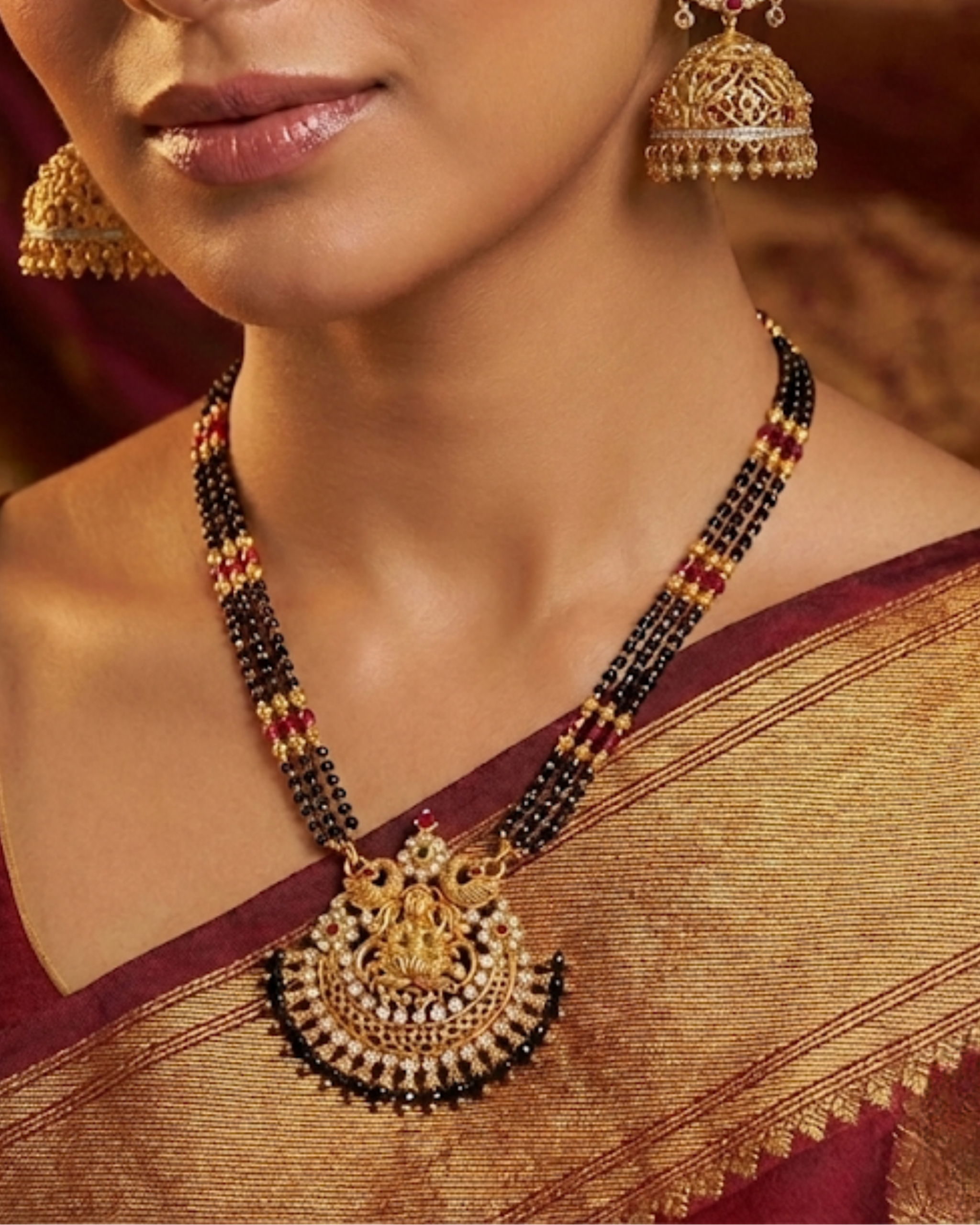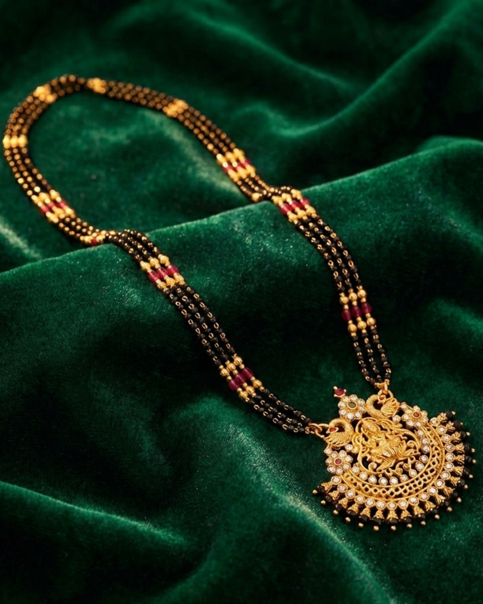 Traditional black-beaded mangalsutra necklace featuring an ornate Lakshmi temple pendant with gold detailing and stone accents, perfect for bridal and festive wear.