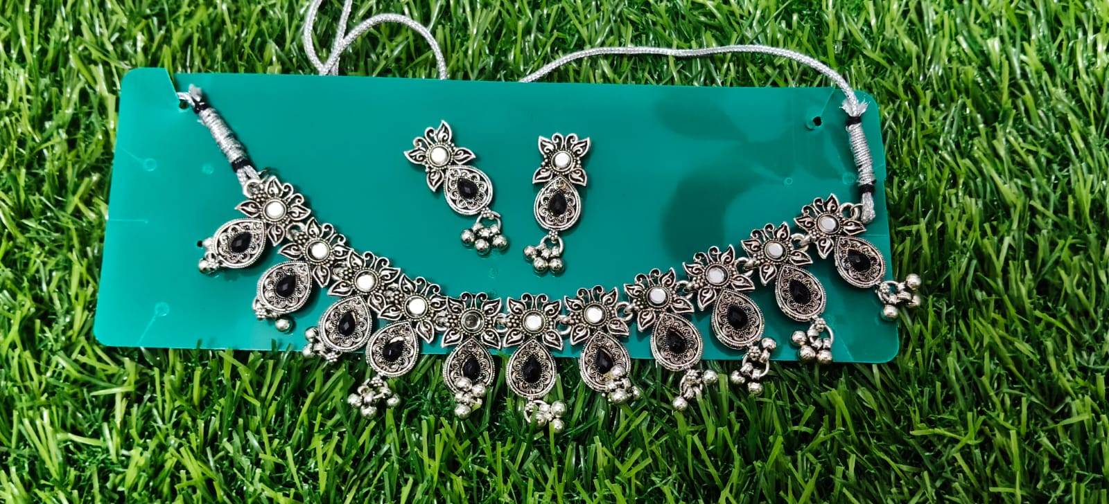 Elegant oxidised silver choker necklace with black stone detailing and matching earrings, perfect for ethnic, fusion, and festive looks.