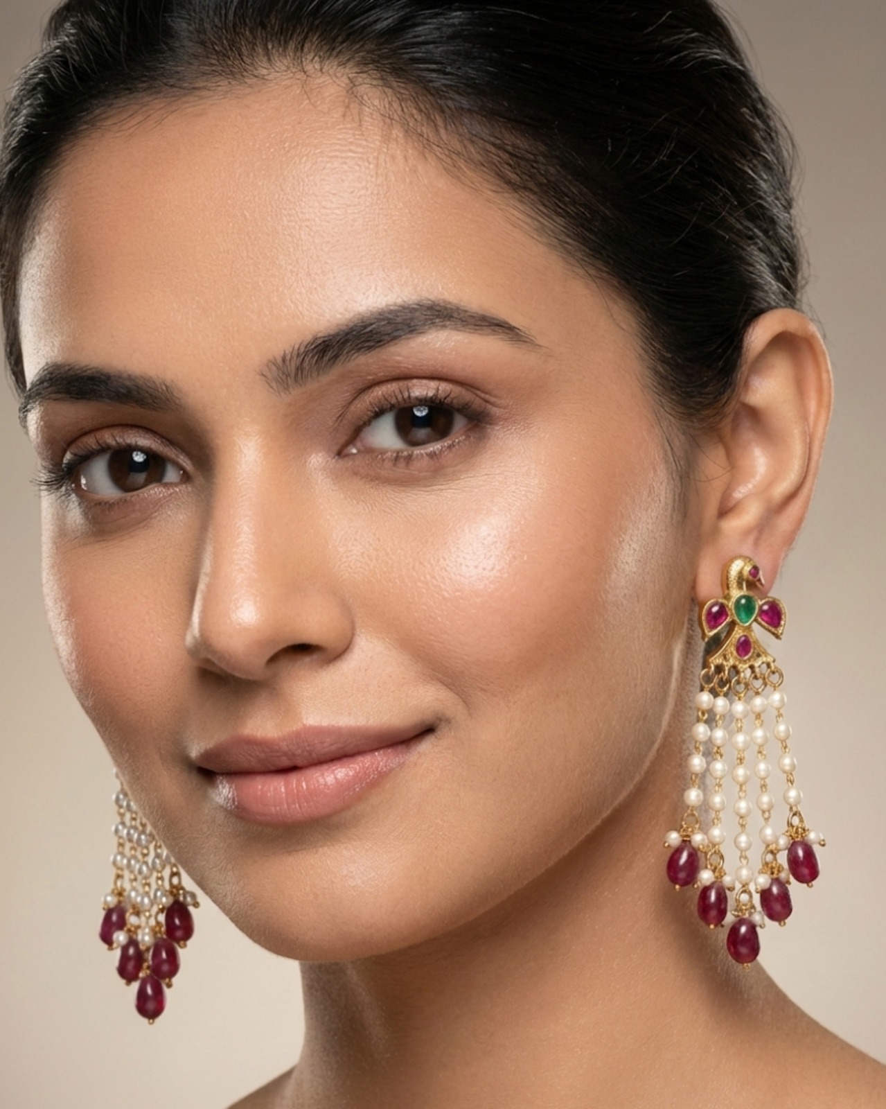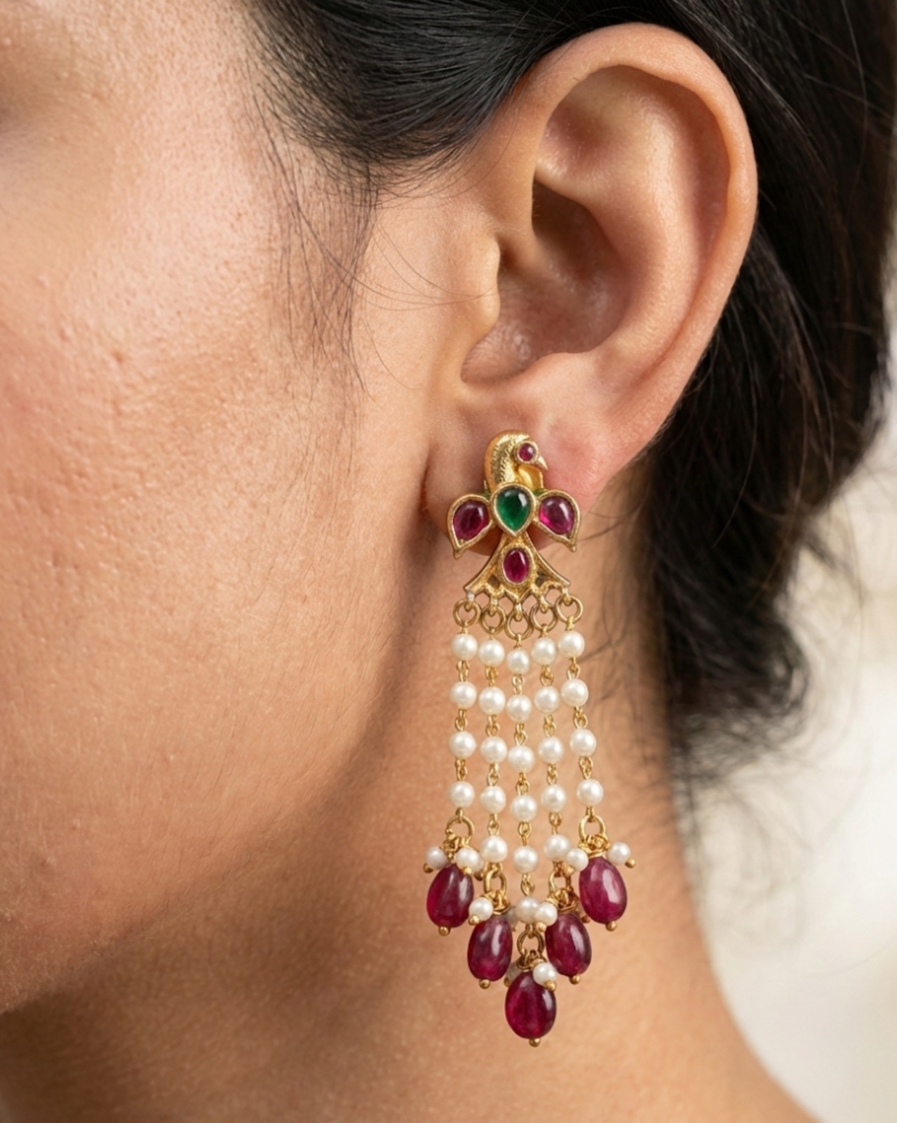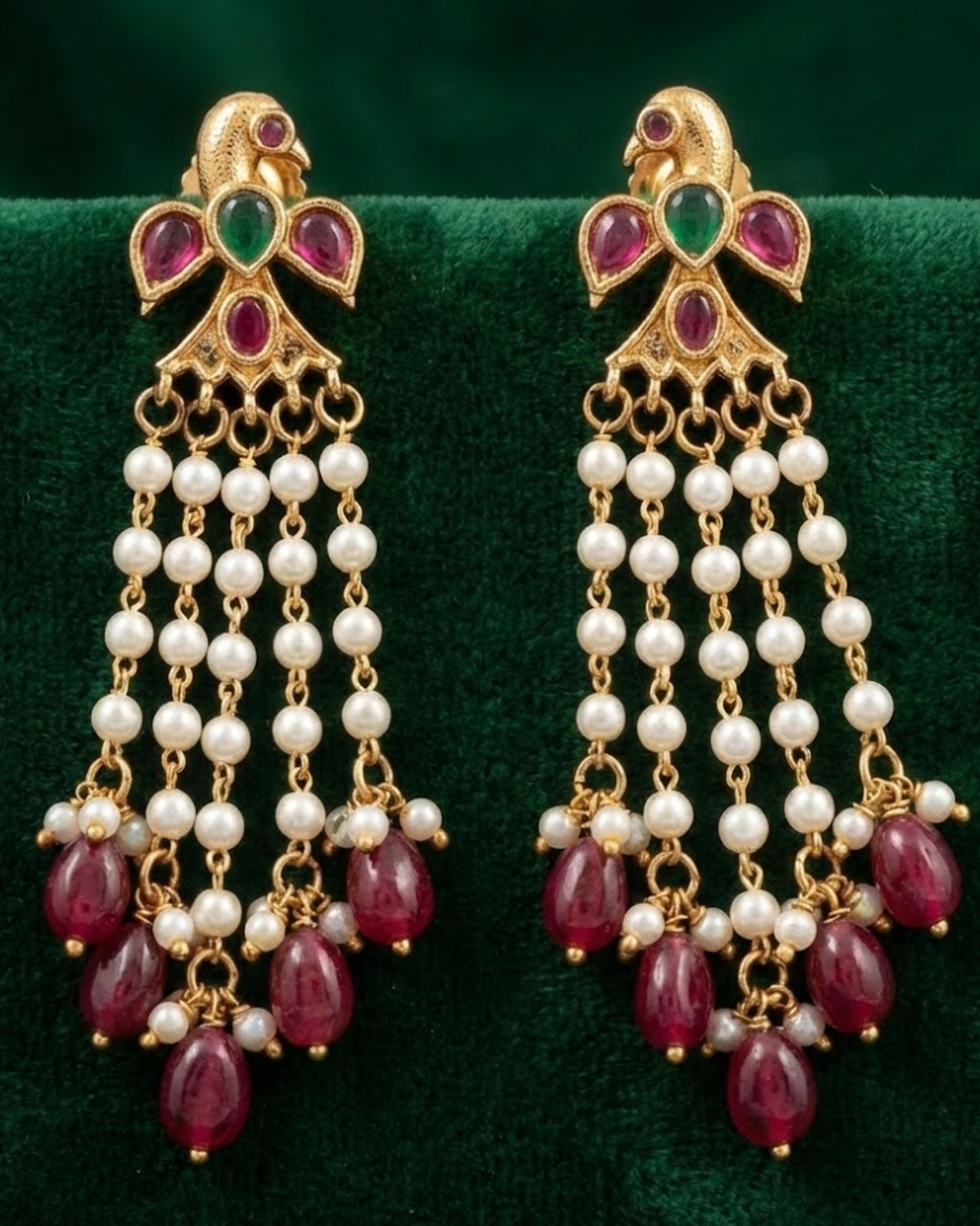Traditional peacock-motif earrings adorned with multicolour stones, cascading pearl chains, and deep ruby bead drops—perfect for festive and ethnic looks.