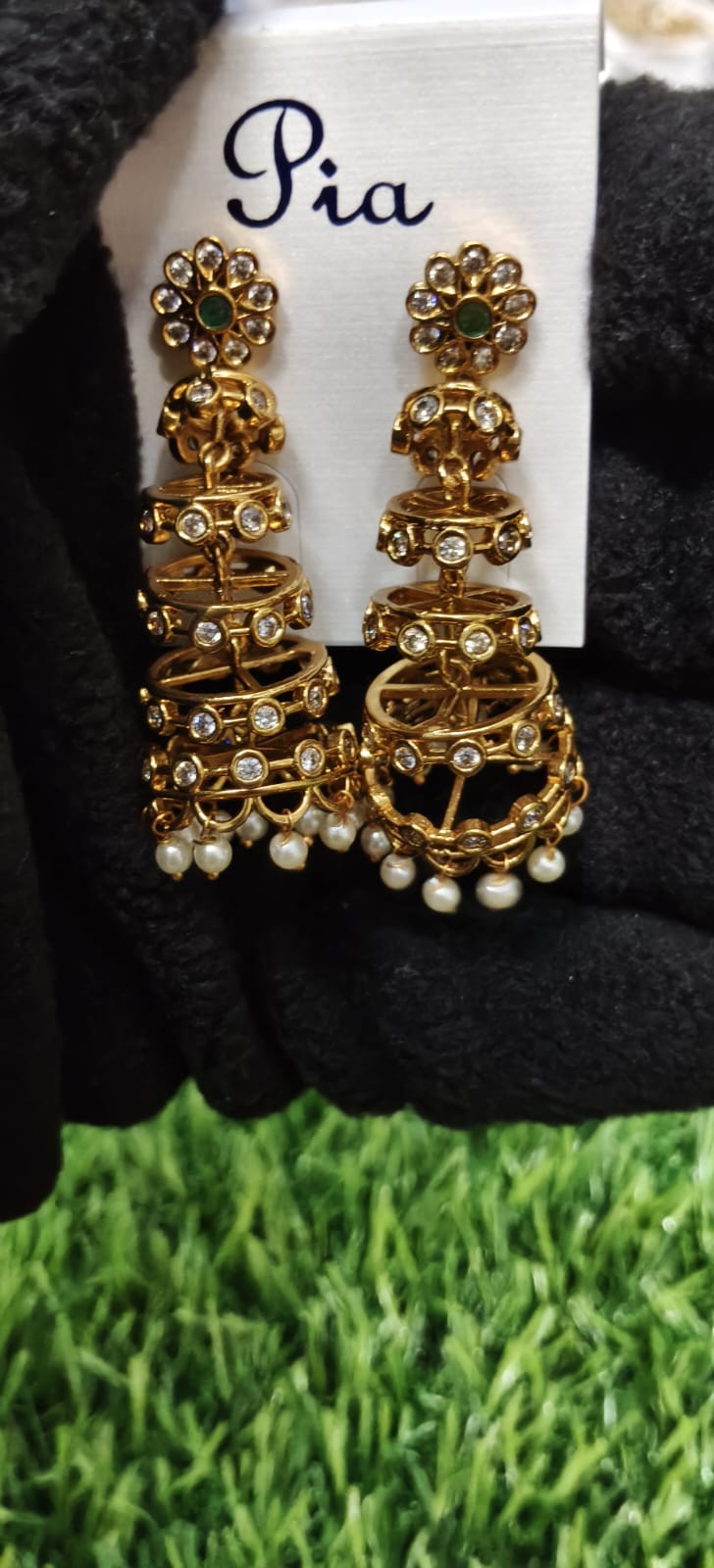 Elegant gold-toned layered jhumka earrings embellished with sparkling stones and delicate pearl drops, perfect for weddings and festive occasions.