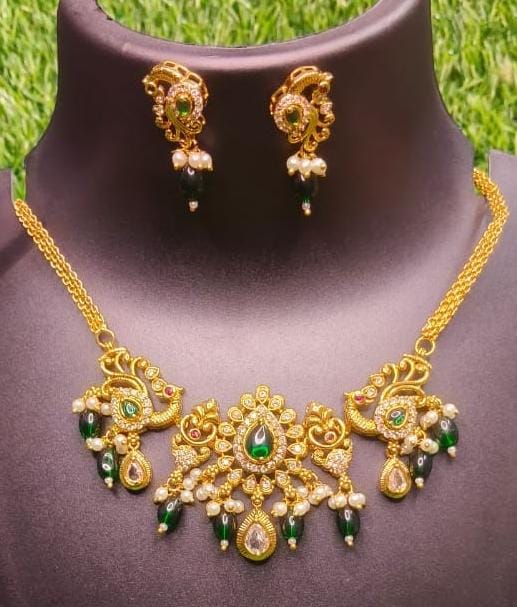 A curated ethnic jewelry collection featuring a pair of vibrant floral stone studs alongside two majestic antique peacock necklace sets in rich ruby-red and emerald-green themes. Each piece is intricately crafted with shimmering crystals, traditional gold-plating, and delicate pearl and bead drops, offering a versatile and regal ensemble for any festive celebration.