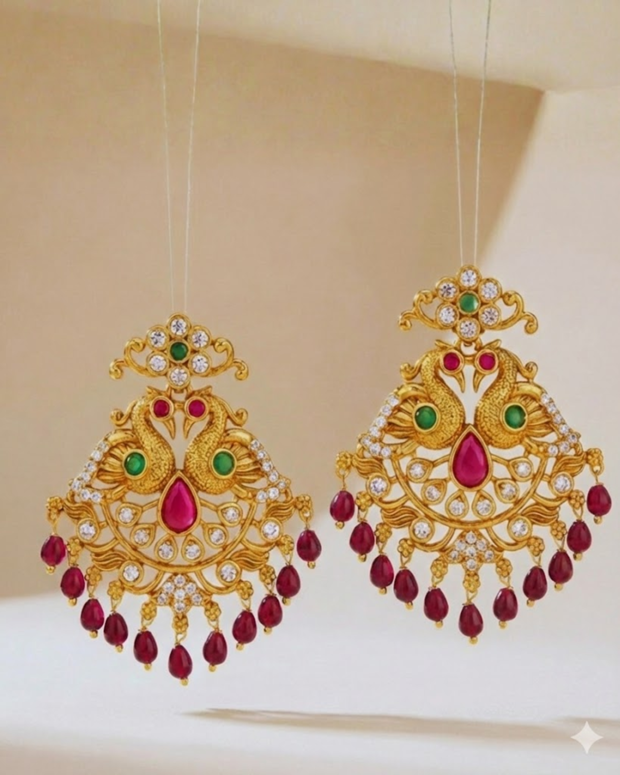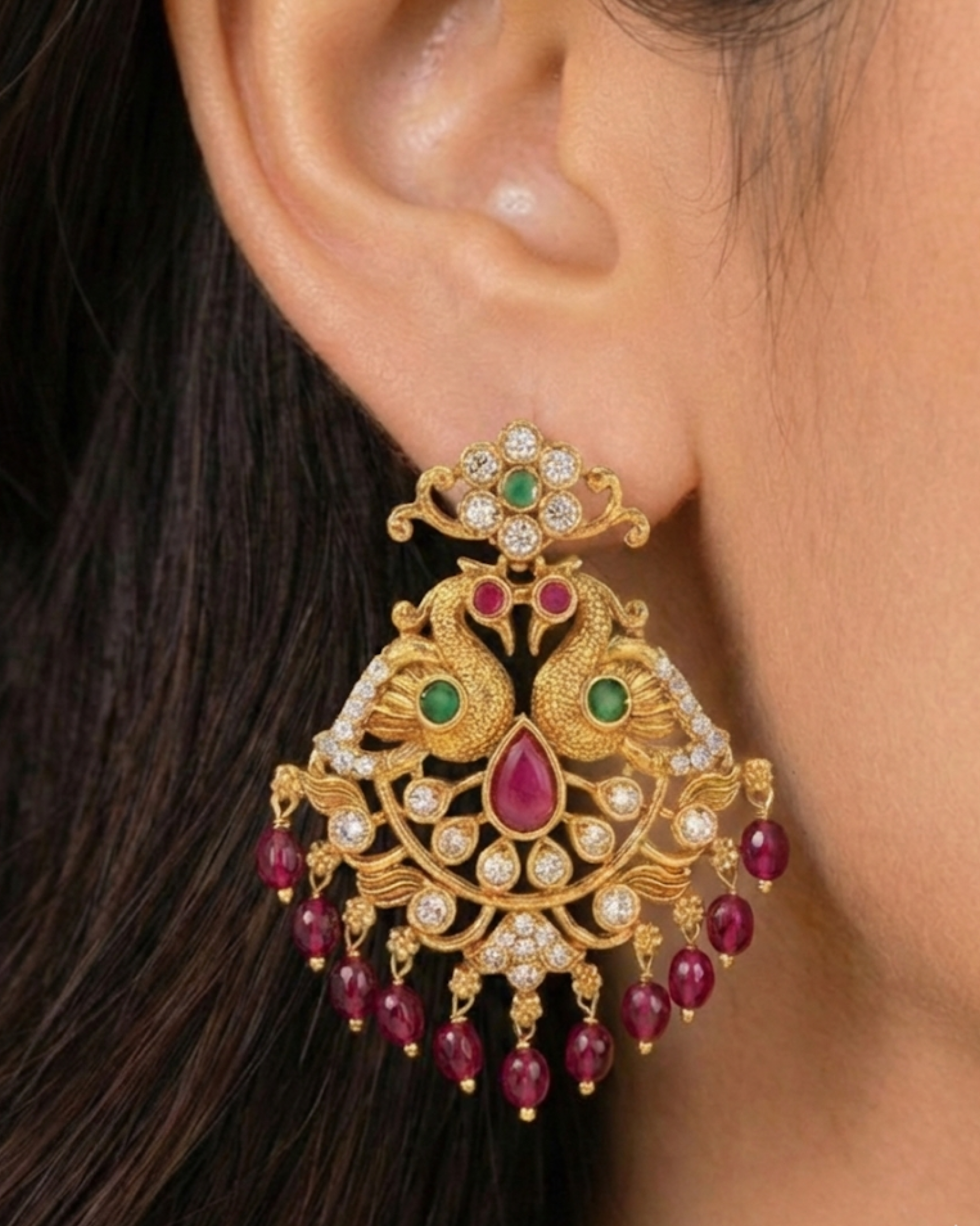Magnificently designed chandbali earrings featuring twin peacock motifs, a ruby-pink teardrop centerpiece, sparkling crystal detailing, and elegant emerald-green bead drops—perfect for bridal wear, weddings, and grand festive occasions.
