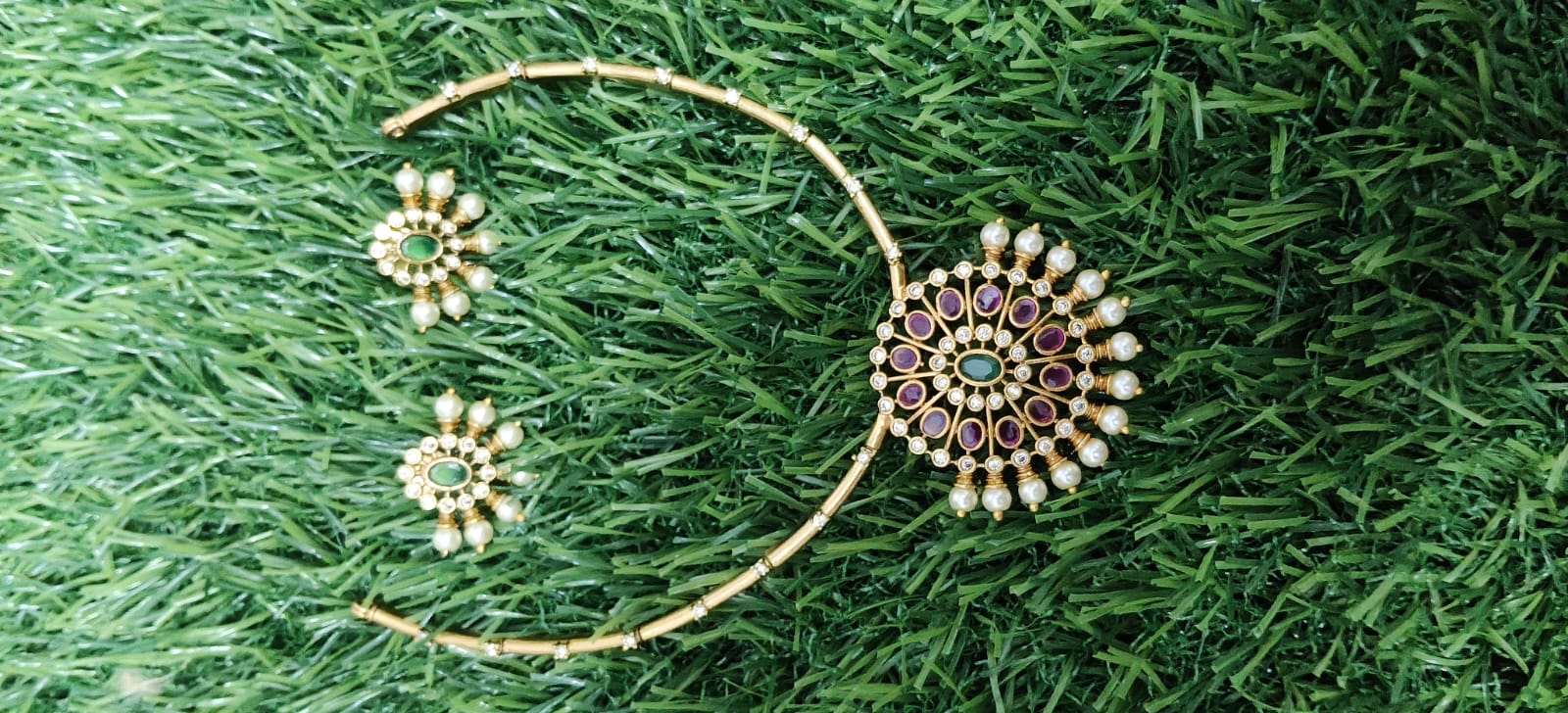 Elegant gold-toned choker necklace with a circular ruby–emerald stone pendant and pearl detailing, paired with matching stud earrings—perfect for weddings and festive wear.