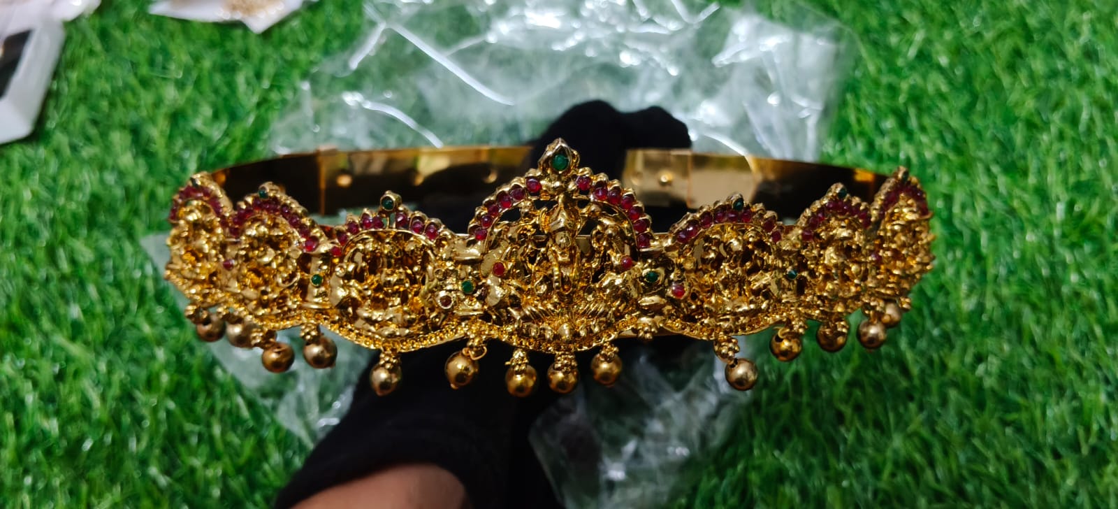 Exquisite gold-toned temple vaddanam with intricate goddess motifs, ruby–emerald accents, and hanging ghungroo beads—perfect for bridal and grand traditional occasions.