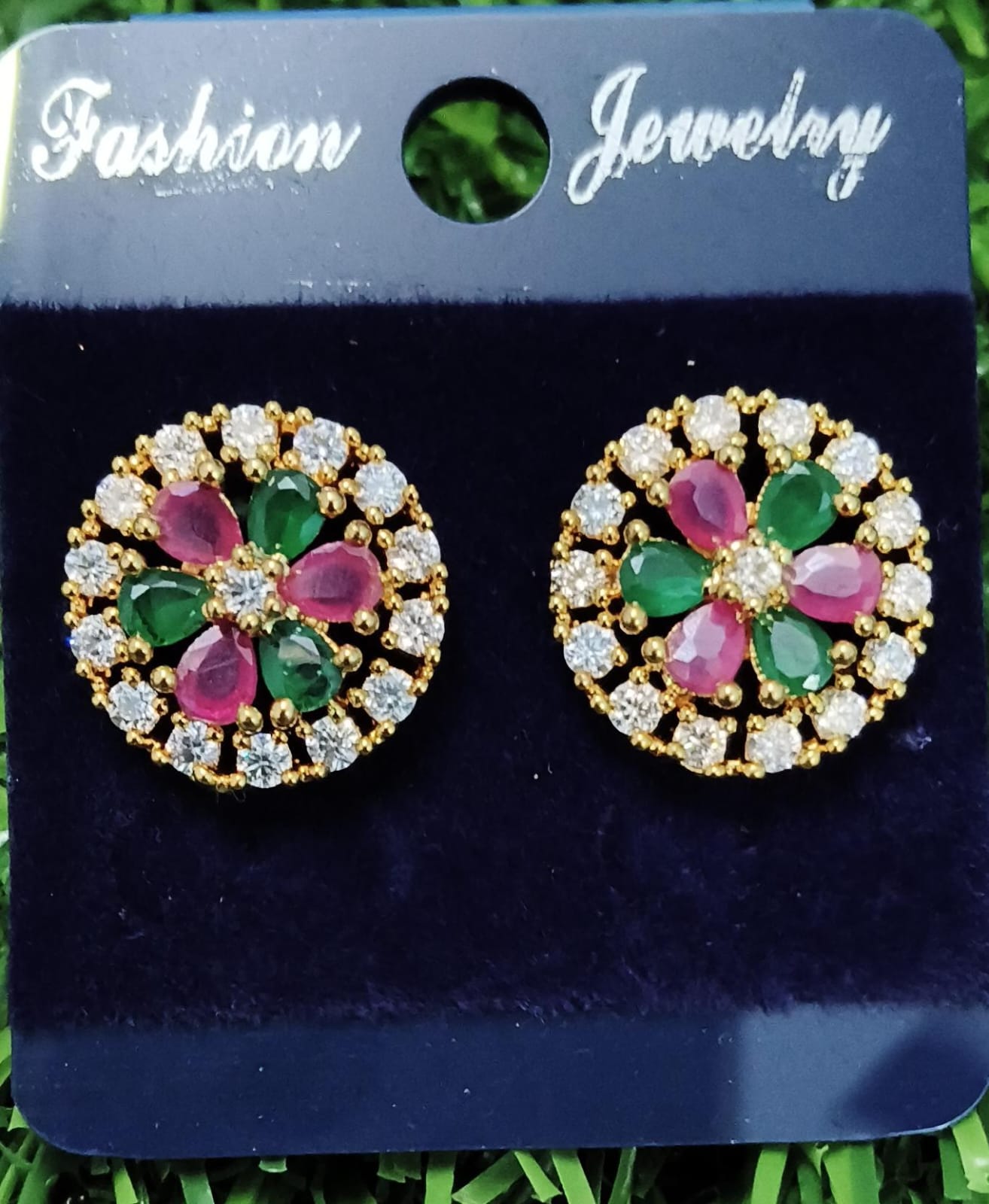 Elegant circular stud earrings featuring a vibrant floral center of alternating ruby-pink and emerald-green stones. The design is framed by a shimmering halo of clear crystals set in a gold-toned finish for a sophisticated, classic look.