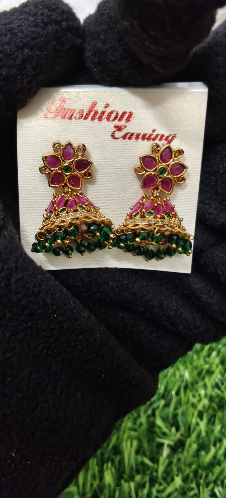 Charming gold-toned floral jhumka earrings adorned with ruby-pink stones, emerald green bead drops, and intricate detailingâperfect for festive and traditional wear.