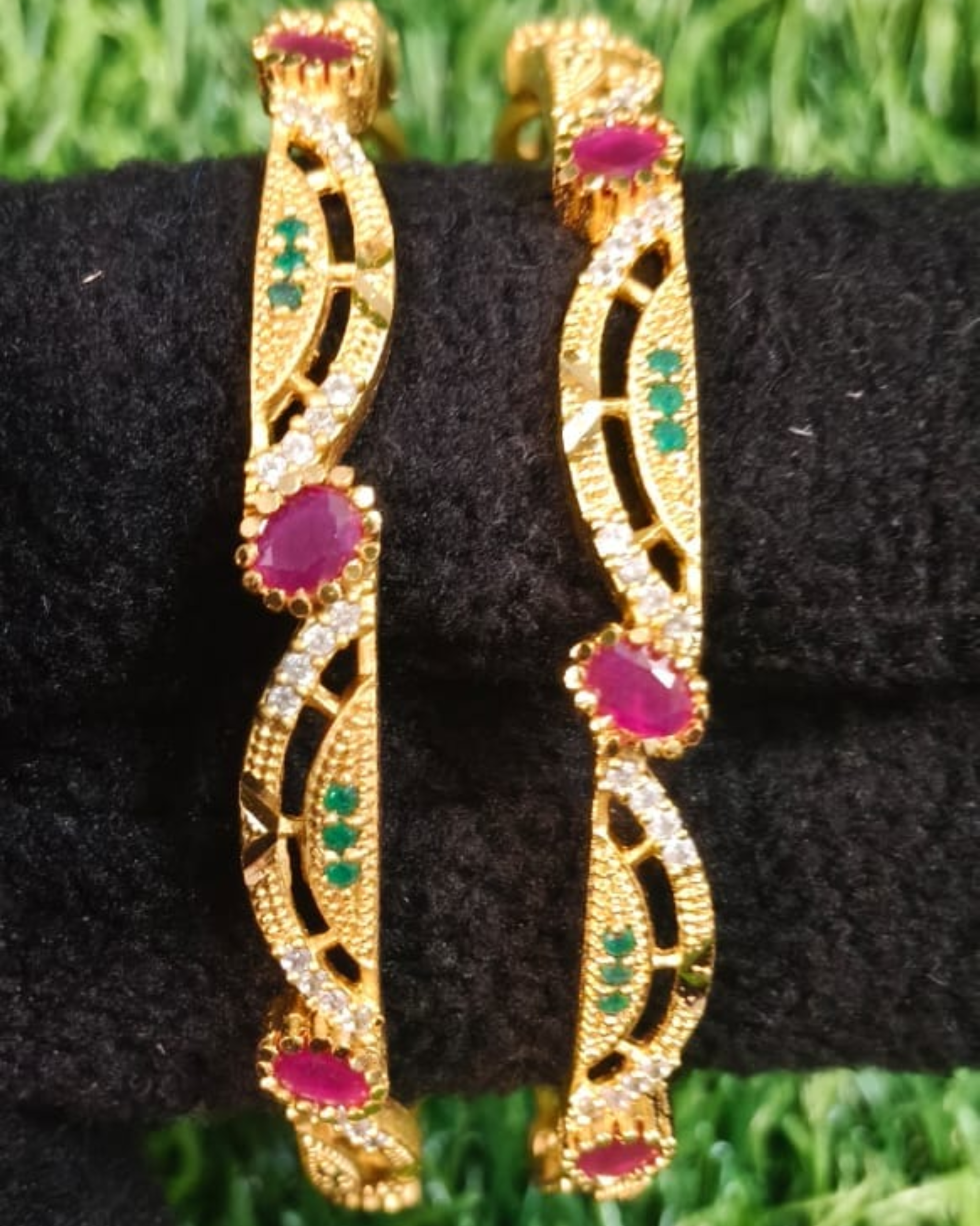 Gracefully designed gold-finish bangles featuring a flowing wave pattern adorned with ruby-tone stones, sparkling accents, and subtle green highlights—perfect for festive wear and special occasions.